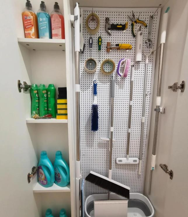 我建议利用卫生间或厨房的空墙面,用挂钩和小置物架集中收纳,既便于拿取,也避免工具占用地面空间。