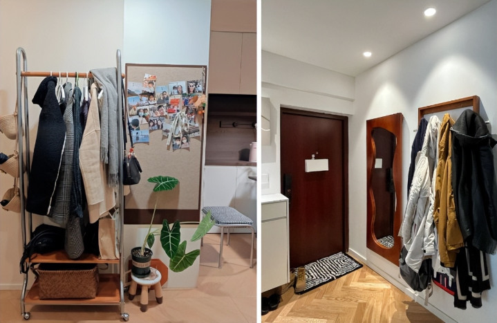 1、玄关:专门放外套和日常衣物,可以用衣帽架或者墙面挂钩,保证进门就有落点。