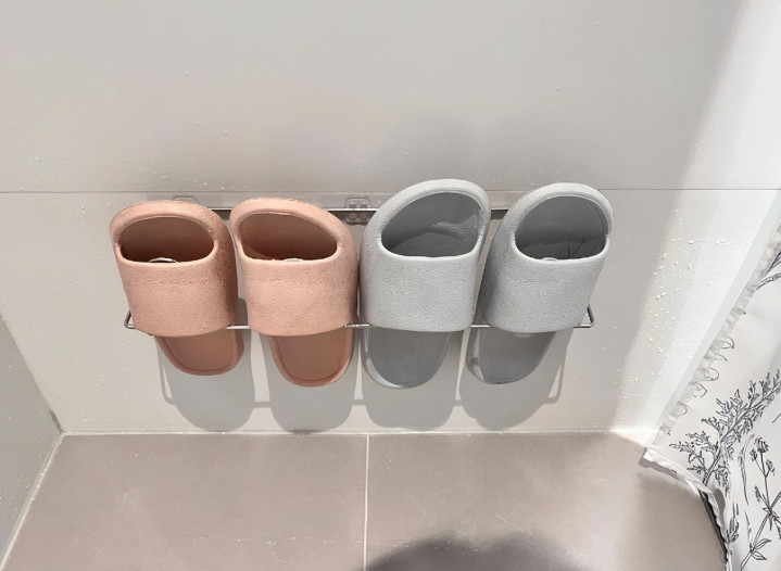 卫生间用的拖鞋也最好有挂墙的方案,我家就是在墙面装了一个小架子,拖鞋一挂就干净整齐,也不占地面空间。