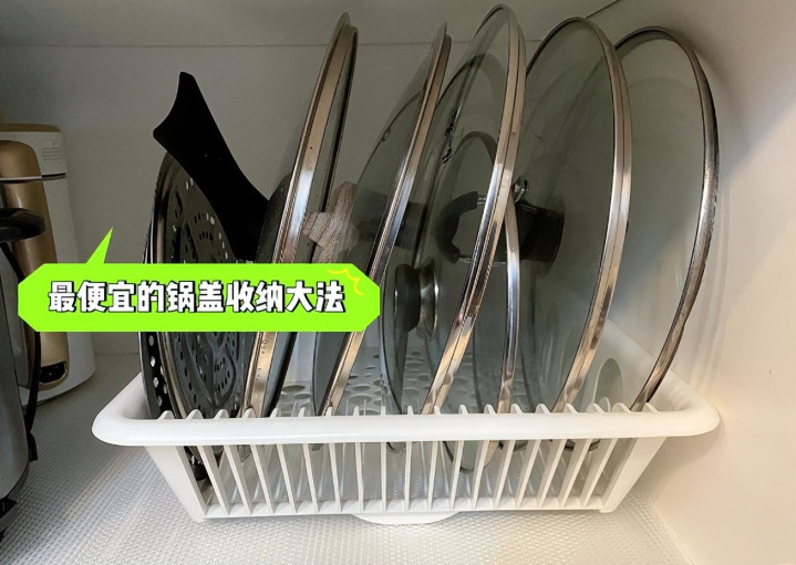 3、柜内集中收纳:用碗篮或分隔板,把锅盖放在一起,操作时顺手又整洁。