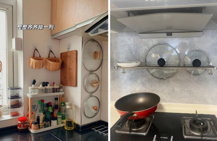 1、墙面收纳:挂钩或者小架子都可以,把锅盖挂好,拿取方便。