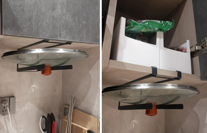 2、吊柜下方:装一个支架把锅盖倒挂,既不占空间,也容易抓取。